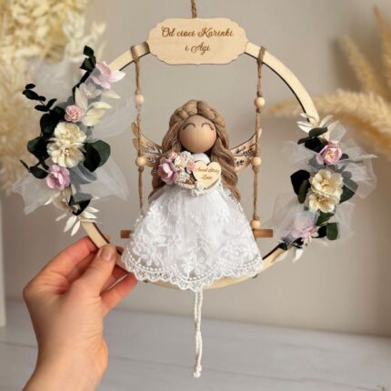 Makramowy anioł stróż z koronką, prezent na chrzest i komunię