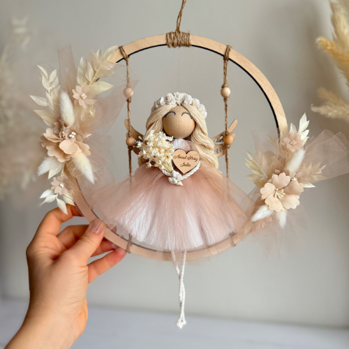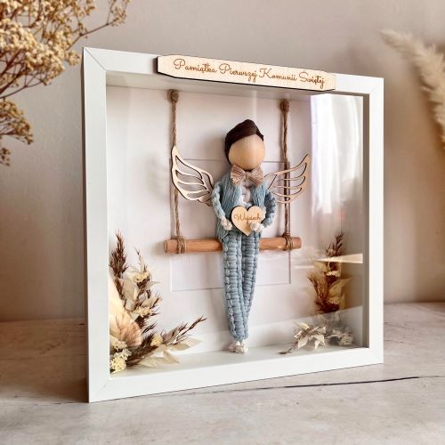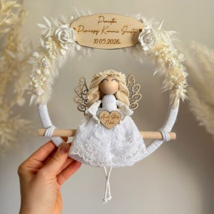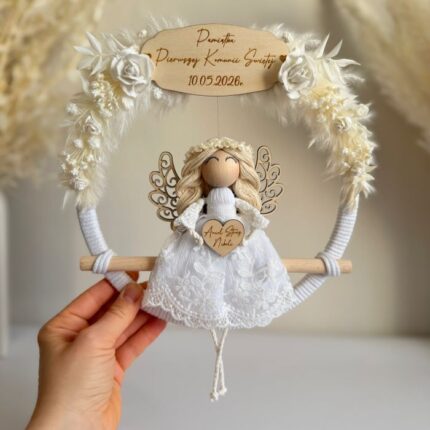 Makramowy aniołek dla chłopca, pamiątka komunii prezent na chrzest w stylu boho