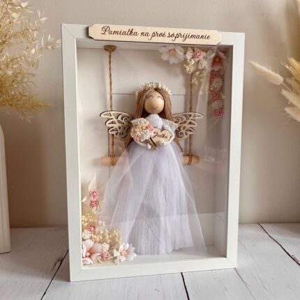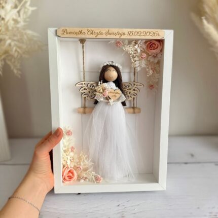 Anioł stróż makrama w ramce, gablotka Komunia i Chrzest