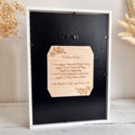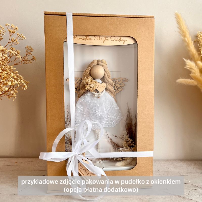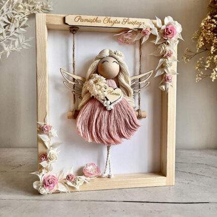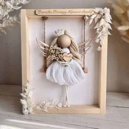 Aniołek wykonany jest z wysokiej jakości sznurka bawełnianego wyprodukowanego w Polsce oraz drewnianych dodatków. Anioł stróż trzyma w rękach delikatny bukiecik z suszonych kwiatów oraz drewniane serduszko z grawerem. Dodatkowo na górze ramki znajduje się drewniana tabliczka z napisem, którą można spersonalizować. Z przodu ramki umieszczona szybka (plexi).