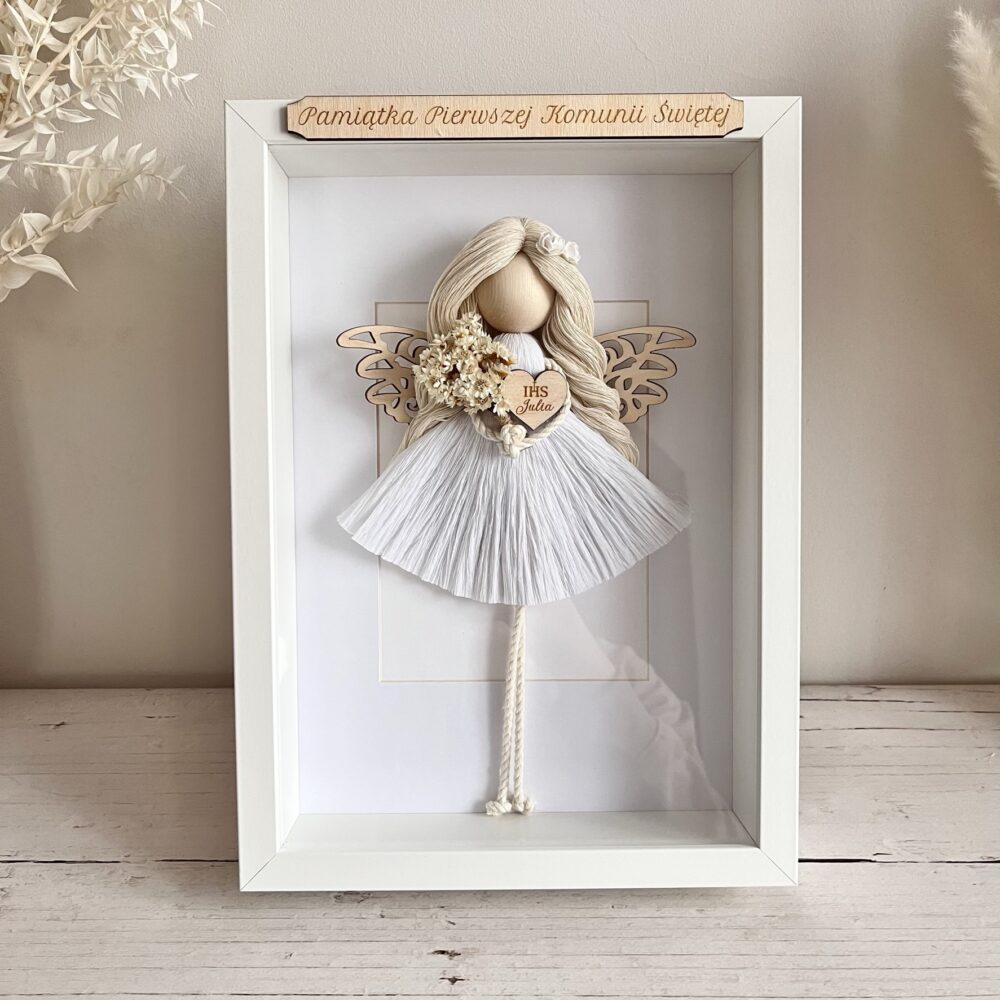 Makramowy anioł stróż w eleganckiej gablotce – wyjątkowy prezent na ważne uroczystości jak Komunia Święta, Chrzest czy roczek dziewczynki.