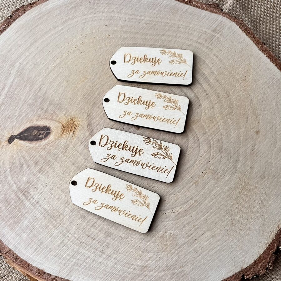 Drewniana etykieta, metka do zamówień, dziękuję za zamówienie