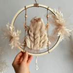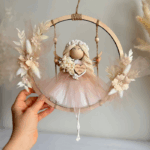 Tworzę aniołka z drewnianych elementów, miękkiego sznurka i lekkiego tiulu w odcieniu beżu. W dłoniach trzyma bukiecik suszonych kwiatów, a głowę zdobi wianek z jasnych różyczek. Obręcz dekoruję kompozycją materiałowych i suszonych roślin, które nadają całości naturalny i subtelny wygląd.