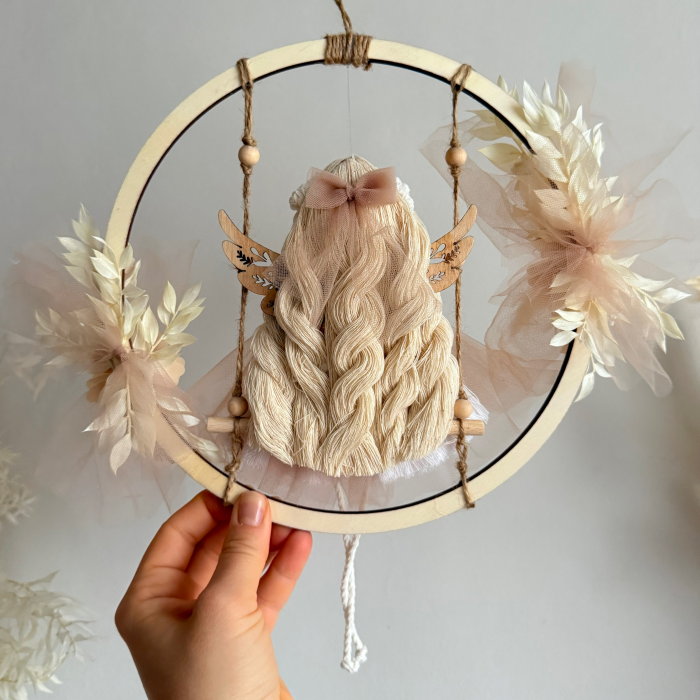 Ręcznie robiony makramowy anioł stróż z tiulem, który zachwyca delikatnością i naturalnością – idealny prezent na chrzest święty, roczek oraz urodziny