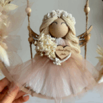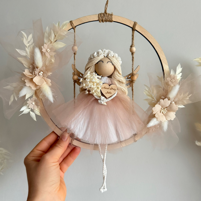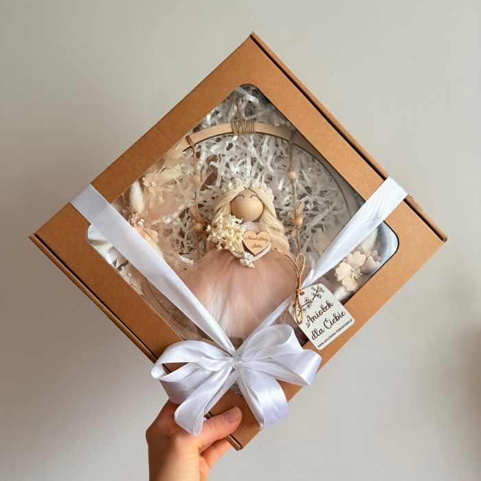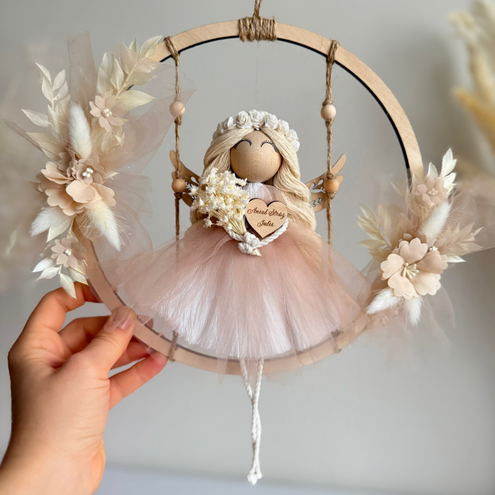 Delikatny aniołek w beżowej, tiulowej sukience zachwyca lekkością i naturalnym charakterem. Idealnie sprawdzi się jako prezent na Chrzest Święty, Komunię, roczek lub urodzinki. Po zawieszeniu w pokoju dziecka wprowadzi do wnętrza ciepło, harmonię i stanie się symbolicznym opiekunem maluszka.