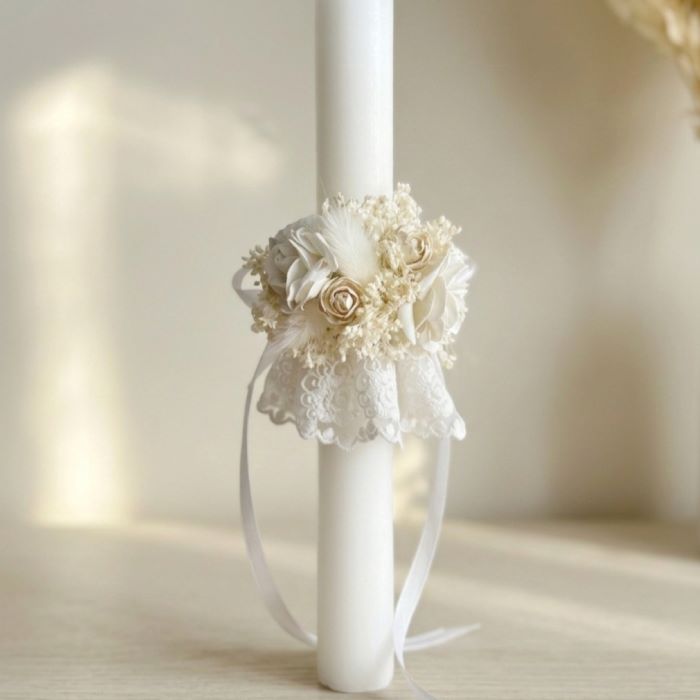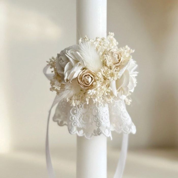 Wyjątkowa, elegancki ozdoba na świecę tworzona z myślą o najpiękniejszym dniu w życiu dziewczynki – Pierwszej Komunii Świętej. Delikatna kompozycja w odcieniach kremu i złamanej bieli jest lekka i dziewczęca.