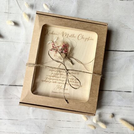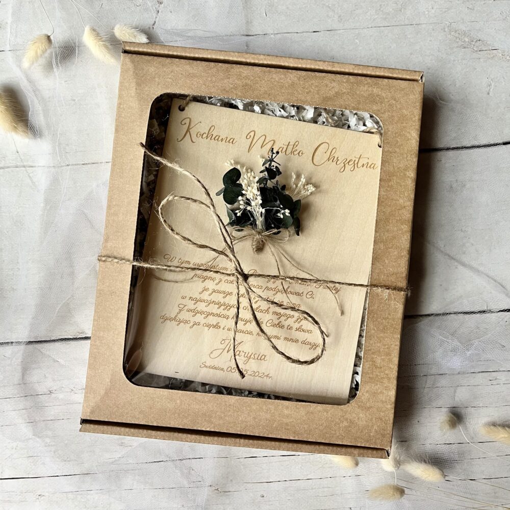 Każda tabliczka z podziękowaniem dla Matki Chrzestnej jest starannie zapakowana w eleganckie pudełko z okienkiem, przewiązane sznurkiem. Dzięki temu nie musisz się martwić o dodatkowe pakowanie – produkt jest gotowy do wręczenia.