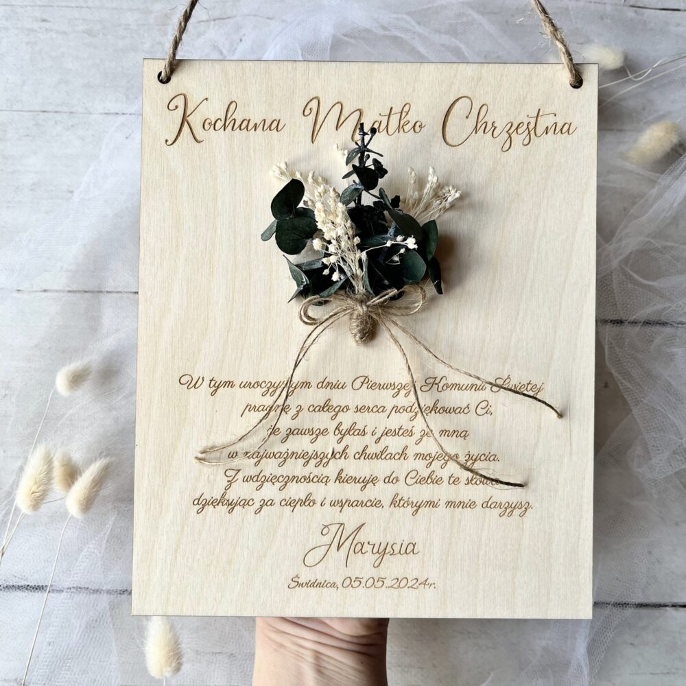 Matka Chrzestna to jedna z najważniejszych osób w życiu dziecka, duchowy opiekun, wsparcie i przewodnik. Dlatego w tym szczególnym dniu, jakim jest Komunia Święta czy Chrzest, warto wyrazić swoją wdzięczność w wyjątkowy sposób. Drewniana tabliczka z podziękowaniem to doskonały pomysł na prezent – jest elegancka, trwała i pełna symboliki.