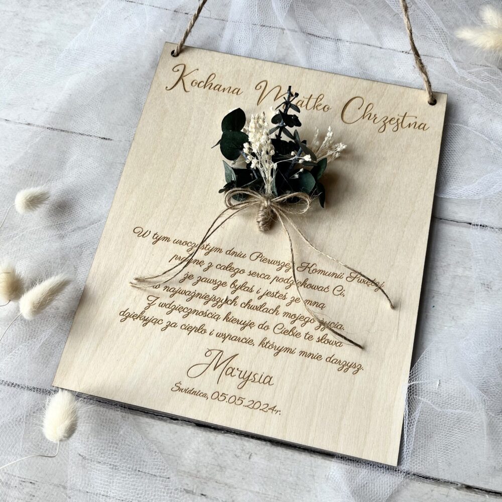 Podziękowanie dla Matki Chrzestnej na Komunię i Chrzest, drewniana tabliczka z życzeniami – idealna alternatywa dla tradycyjnej kartki z podziękowaniem