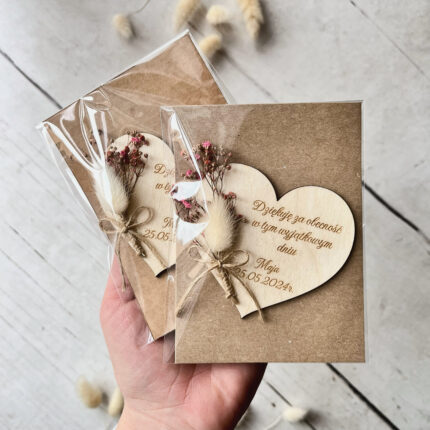 - Unikalność i trwałość – drewniana kartka z podziękowaniem to oryginalna alternatywa dla tradycyjnych kartek papierowych, które często szybko lądują w szufladzie.