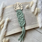 Makramowa zakładka do książki wykonana ze sznurka bawełnianego oraz drewnianego liścia monstery.