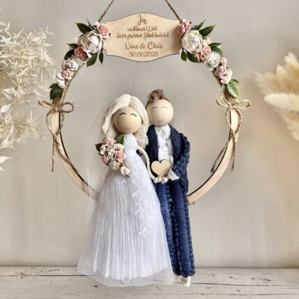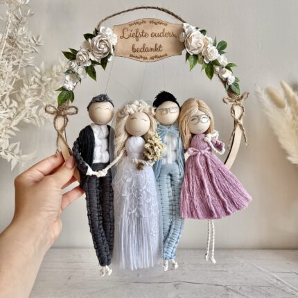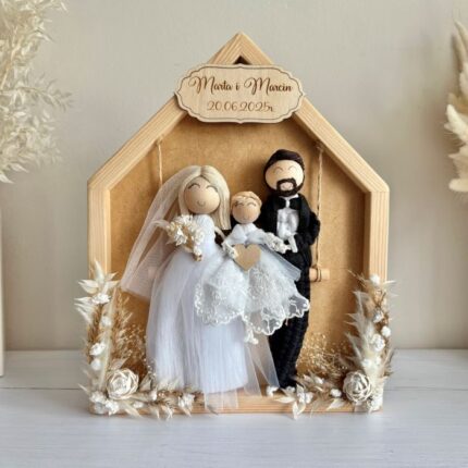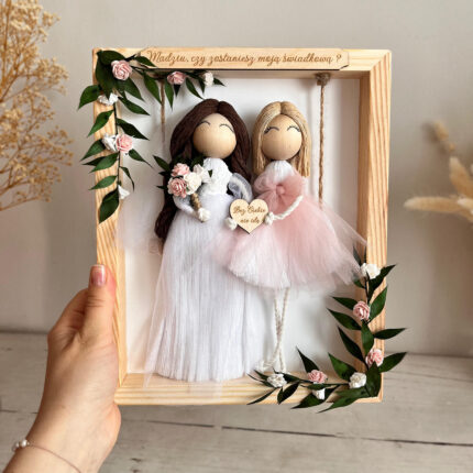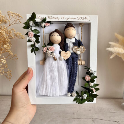 Prezent ślubny, makramowe laleczki w kwiatowej obręczy