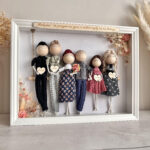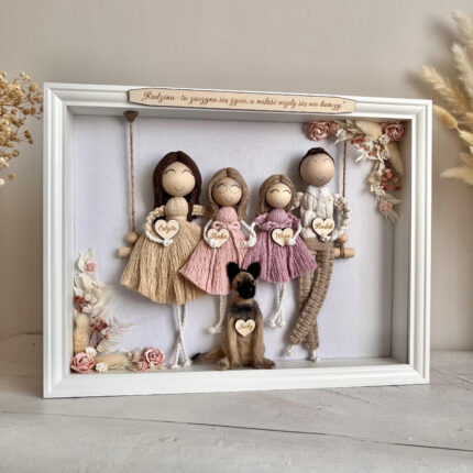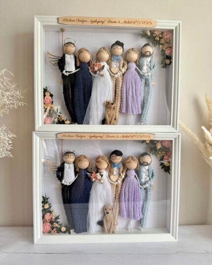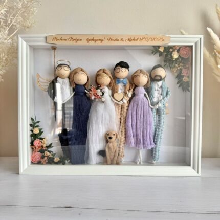 Makramowe laleczki w ramce, personalizowana ręcznie robiona rodzinka w eleganckiej gablotce