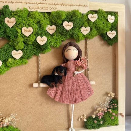 Podziękowanie prezent dla nauczyciela, personalizowana makramowa laleczka z drzewkiem z imionami