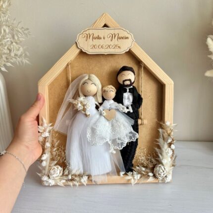 Gablotka, w której siedzą lub stoją laleczki jest ozdobiona suszonymi roślinami i kwiatami (możesz określić jakie to mają być kolory). Na górze ramki jest drewniana tabliczka, na której może się motto rodzinne, krótkie życzenia lub Twoja ulubiona sentencja. Jeśli chcesz, na ramce nie było tabliczki napisz o tym w uwagach do zamówienia.