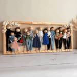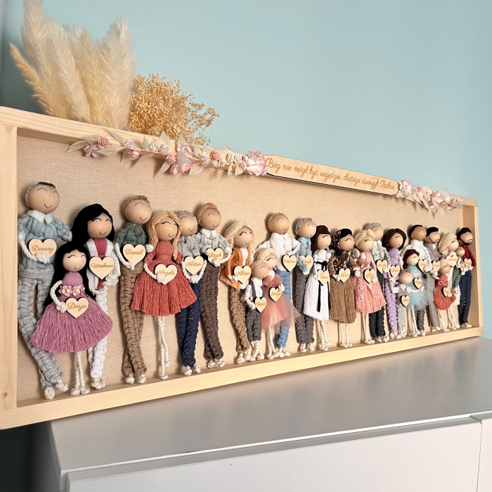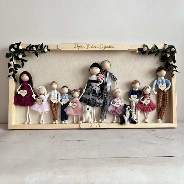 Drewniana ramka XXL na Dzień Babci i Dziadka jest dopasowywana do liczby laleczek, dzięki czemu każda postać jest czytelna i estetycznie wyeksponowana.