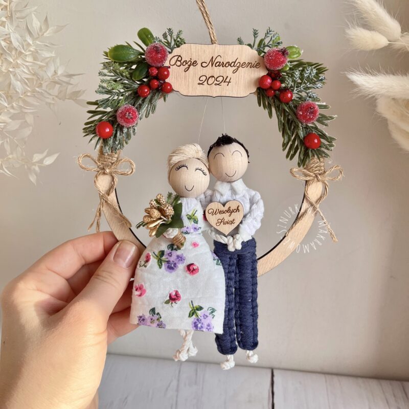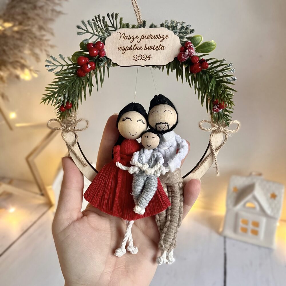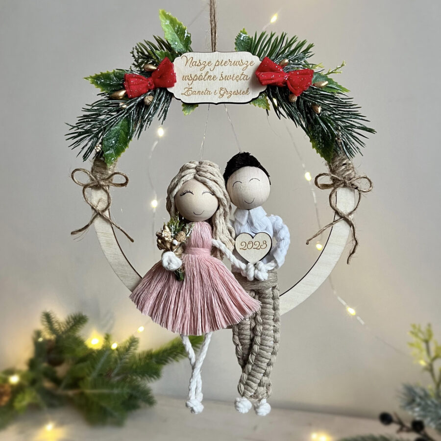Każdą bombkę tworzę z wyjątkową precyzją, a makramowe laleczki możesz spersonalizować według własnych upodobań. Możesz określić wygląd laleczek, tak aby rzeczywiste osoby. Możesz dostosować kolor włosów i ubiór, aby stworzyć unikalną ozdobę, która będzie miała wyjątkowe, osobiste znaczenie. Zdobienie obręczy wianuszkiem świątecznym sprawia, że dekoracja jest bardziej efektowna. Dzięki personalizacji Twoja bombka stanie się jedyną w swoim rodzaju ozdobą, która zachwyci wszystkich.