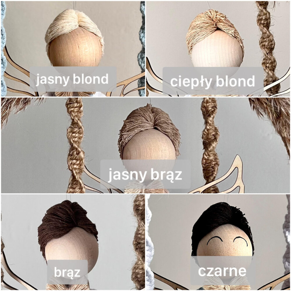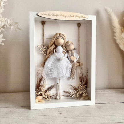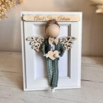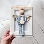 Każdego aniołka tworzę ręcznie, z pełnym zaangażowaniem i dbałością o detale. Używam naturalnego sznurka bawełnianego oraz drewnianych elementów, dzięki czemu dekoracja jest nie tylko estetyczna, ale też trwała i ekologiczna. Aniołek siedzi w ramce, a w jego dłoniach znajduje się drewniane serduszko z grawerem lub hostia – wybór należy do Ciebie. Co więcej, mogę umieścić personalizowaną tabliczkę z życzeniami, dedykacją lub modlitwą z tyłu ramki. Dzięki specjalnemu utrwaleniu sznurka, włosy i ubranko aniołka zachowują swój kształt, co nadaje całości estetyczny i schludny wygląd na długie lata.