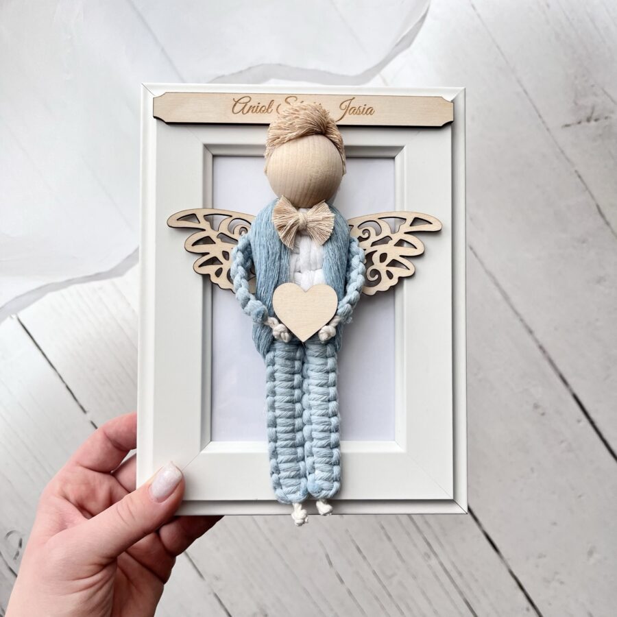 Aniołek makrama w białej ramce dla chłopca