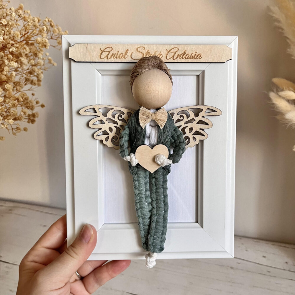 Aniołek makrama w białej ramce dla chłopca – prezent na Chrzest, Komunię i wyjątkowe okazje