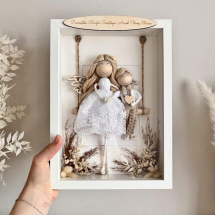 Dekoracja tworzona na zamówienie z dbałością o każdy szczegół i z użyciem bezpiecznych, nietoksycznych materiałów od sprawdzonych dostawców. Wszystkie elementy mocuję trwale i estetycznie, aby zapewnić nie tylko piękny wygląd, ale i bezpieczne użytkowanie. Ramka z aniołkiem pełni funkcję dekoracyjną i najlepiej prezentuje się ustawiona w dobrze widocznym miejscu, na przykład na komodzie, półce lub powieszona na ścianie. Nie jest zabawką, dlatego nie nadaje się do zabawy przez dzieci.