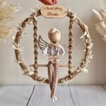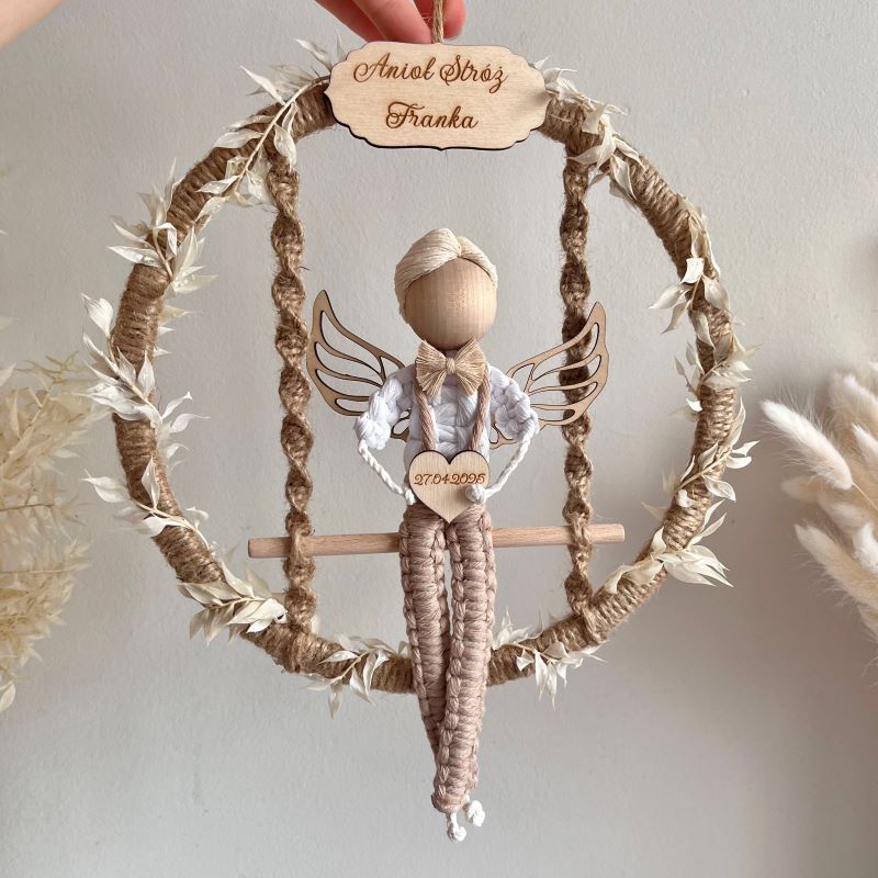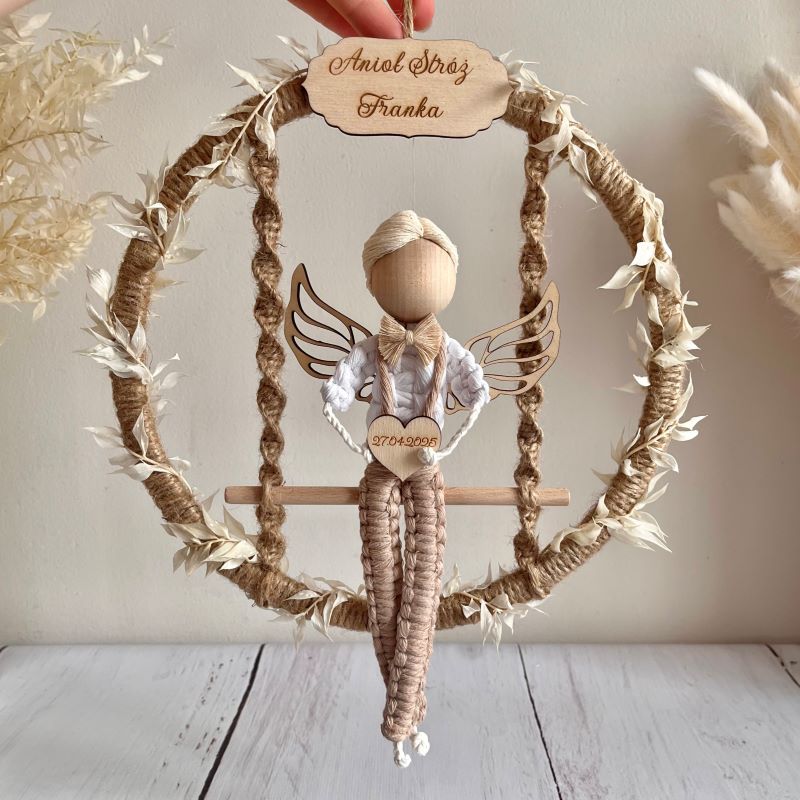 Aniołek wykonany ze sznurka bawełnianego oraz drewnianych elementów. Siedzi na huśtawce w obręczy owiniętej sznurkiem jutowym, a w rączkach trzyma drewniane serduszko z imieniem. Obręcz jest ozdobiona kremowo białymi listkami, a u góry znajduje się drewniana tabliczka z grawerem. Możesz określić kolorystykę aniołka oraz napisy na drewnianych tabliczkach.