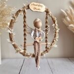Makramowy aniołek w obręczy zdobionej suszonymi listkami jest prostą dekoracją, która będzie idealna jako prezent na Chrzest, Komunię oraz roczek chłopca. Będzie pięknym dopełnieniem wnętrza urządzonego w stylu rustykalnym, boho, w którym dominują naturalne barwy i dekoracje.