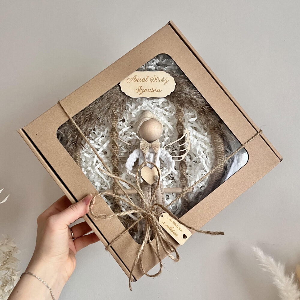 Każdego makramowego aniołka pakuję w bibułkę oraz kartonik. Jeśli chcesz, abym zapakowała aniołka w eleganckie pudełko z okienkiem możesz to określić w opcjach zamówienia.