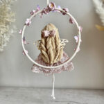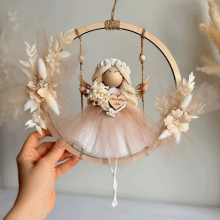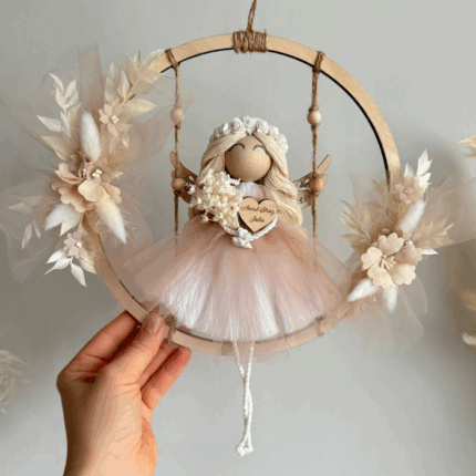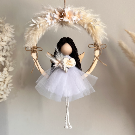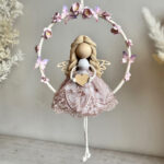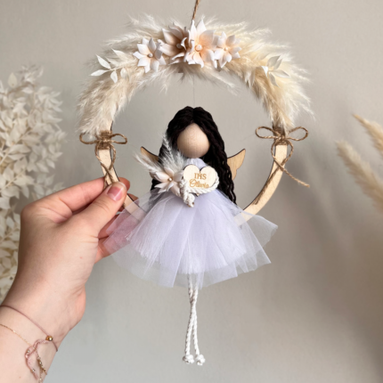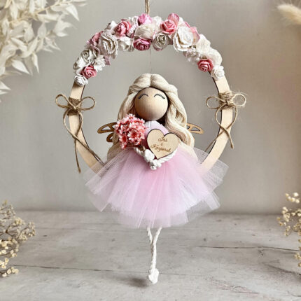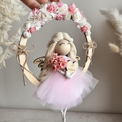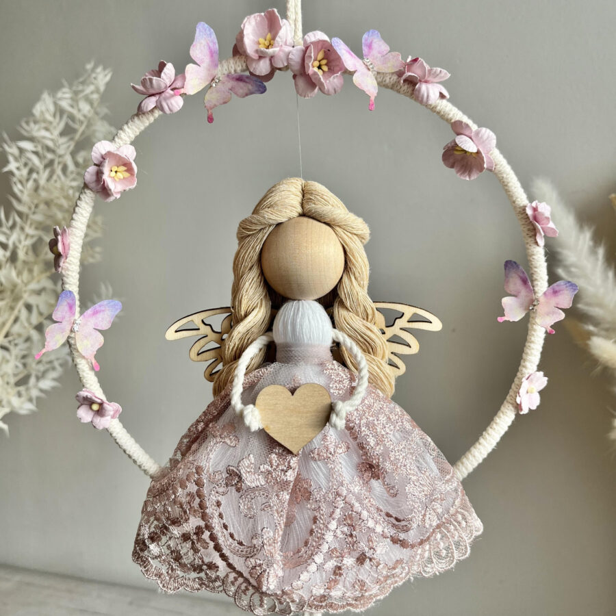 Aniołek wykonany z bawełnianego sznurka, różowej koronki oraz drewnianych elementów. Włosy anioła zdobi koronkowa kokardka przyczepiona z tyłu. Aniołek trzyma w rękach drewniane serce, na którym można wygrawerować tekst, np. „Anioł na szczęście”, „Anioł Stróż Lili”, „Chrzest Lilii”. Anioł stróż siedzi w białej obręczy ozdobionej papierowymi kwiatami oraz materiałowymi motylkami w odcieniach różu i delikatnego fioletu. Możesz wybrać kolor włosów anioła oraz określić napis na drewnianym serduszku.