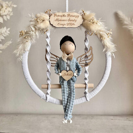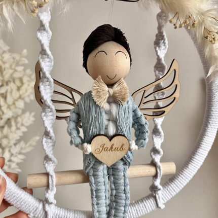 Anioł stróż dla chłopca na chrzest i roczek, makramowy aniołek w obręczy