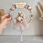 Makramowy anioł w obręczy z kwiatami bawełnianymi jest lekką dekoracją, która idealnie wpasuje się w nastrój Chrztu Świętego oraz roczku. Jest też świetnym pomysłem na prezent z okazji urodzin lub Komunii Świętej. Będzie prezentem na każdą okazję, a możliwość personalizacji uczyni go wyjątkowym podarunkiem. Jako element dekoracji dziecięcego pokoju wniesie lekkość i świeżość do wnętrz w stylu boho. To świetny pomysł na upominek zarówno dla mniejszych i większych dzieci.