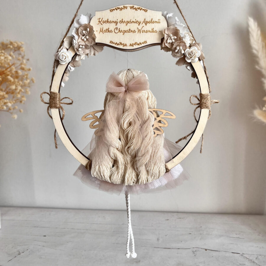 Aniołek jest wykonany ze sznurka bawełnianego, tiulu i drewnianych elementów. W rękach trzyma bukiet suszonych kwiatów i jeśli sobie zażyczysz dodam również serduszko z grawerem. Aniołek siedzi na drewnianej obręczy, która jest ozdobiona bawełnianymi kwiatami w odcieniach bieli, beżu i kremu. Drewniana tabliczka na górze obręczy z Twoim tekstem sprawi, że prezent stanie się bardziej osobisty. Możesz określić również kolor włosów anioła.