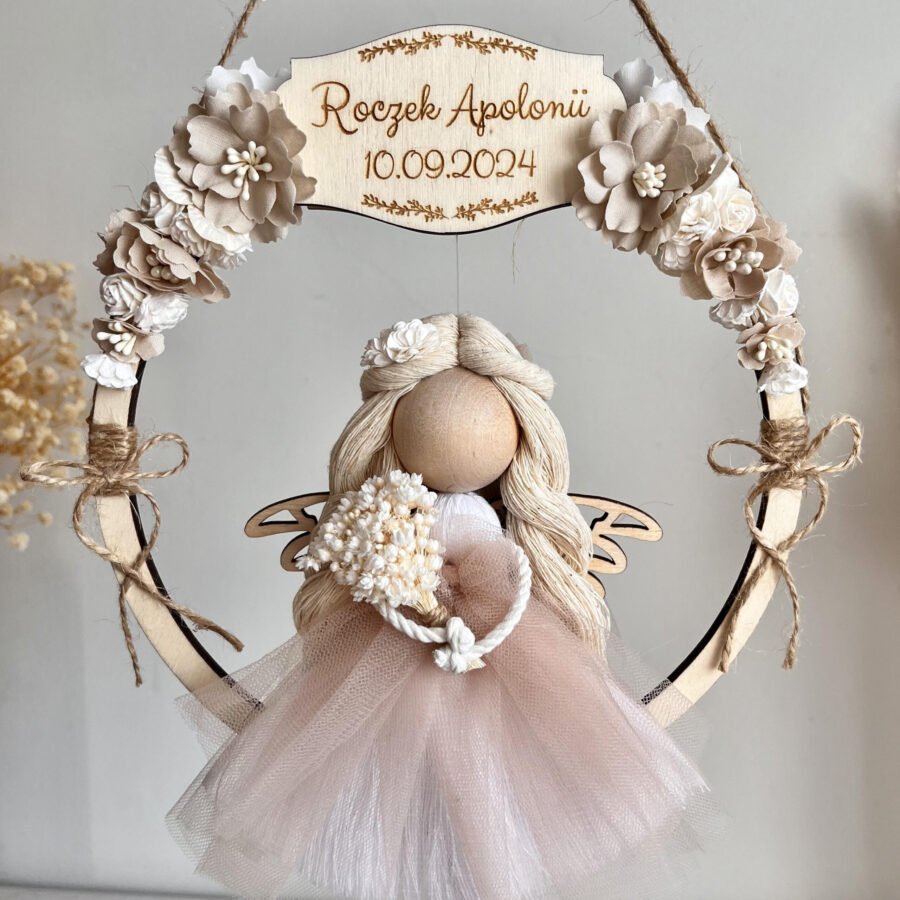 Anioł stróż w kwiatowym wianku, prezent na roczek i chrzest beżowy