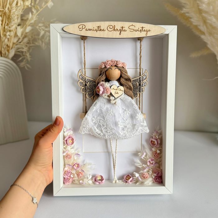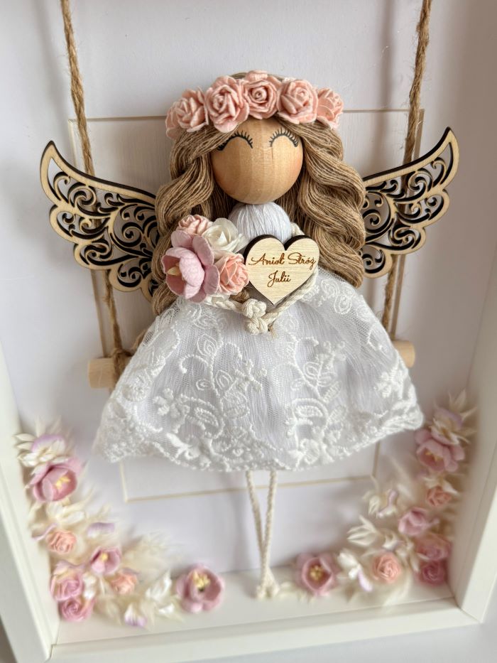 Aniołek w ramce wykonany jest ze sznurka bawełnianego w koronkowej sukience, trzyma w rękach delikatny bukiecik i serduszko z grawerem. Umieszczony na huśtawce w ramce ozdobionej papierowymi oraz suszonymi kwiatami w odcieniach różu, fioletu i bieli. Aniołek ma we włosach różowy wianuszek. Dodatkowo na górze ramki znajduje się drewniana tabliczka z grawerem, którą można spersonalizować. Na odwrocie ramki możesz dodać dedykację lub życzenia (opcja płatna dodatkowo).