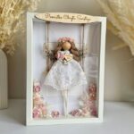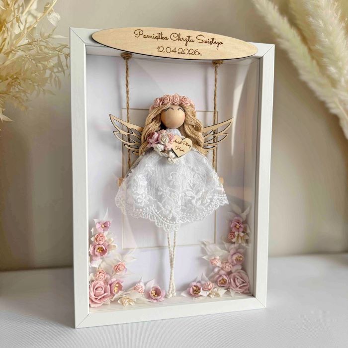 Aniołek w ramce gablotce w kwiatami – prezent na Chrzest i Komunię dziewczynki