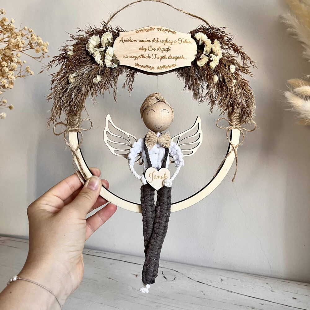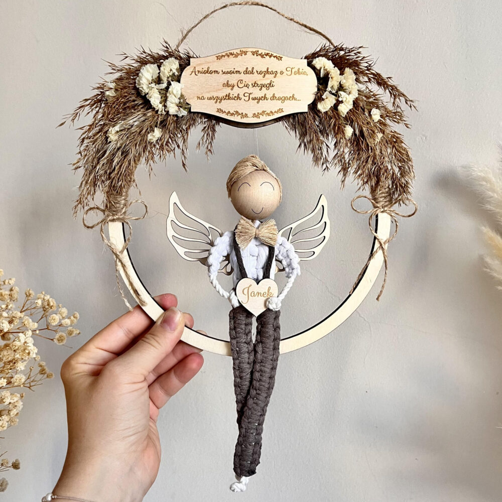 Anioł stróż w stylu boho dla chłopca, makramowy aniołek – prezent na roczek, Chrzest i Komunię