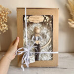 Aniołka standardowo pakuję w bibułkę i karton. Dodatkowo zabezpieczam go do wysyłki, aby dotarł do Ciebie w idealnym stanie. Oferuję także pakowanie na prezent jako opcję płatną. Otrzymasz eleganckie pudełko z okienkiem, przewiązane wstążką, które doda Twojemu prezentowi wyjątkowego charakteru.