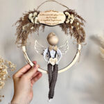 Aniołek jest wykonany ze sznurka bawełnianego oraz drewnianych elementów. Siedzi na obręczy ozdobionej suszonymi trawami, co dodaje mu unikalnego uroku. Na górze obręczy znajduje się drewniana tabliczka z grawerem, na której umieszczę Twój wyjątkowy tekst. Aniołek trzyma w rękach serduszko z grawerem, na którym może być imię. Możesz wybrać piękną kolorystykę aniołka, która najlepiej pasuje do Twojego wnętrza i podać napisy na drewnianych tabliczkach, aby uczynić ten prezent naprawdę wyjątkowym.
