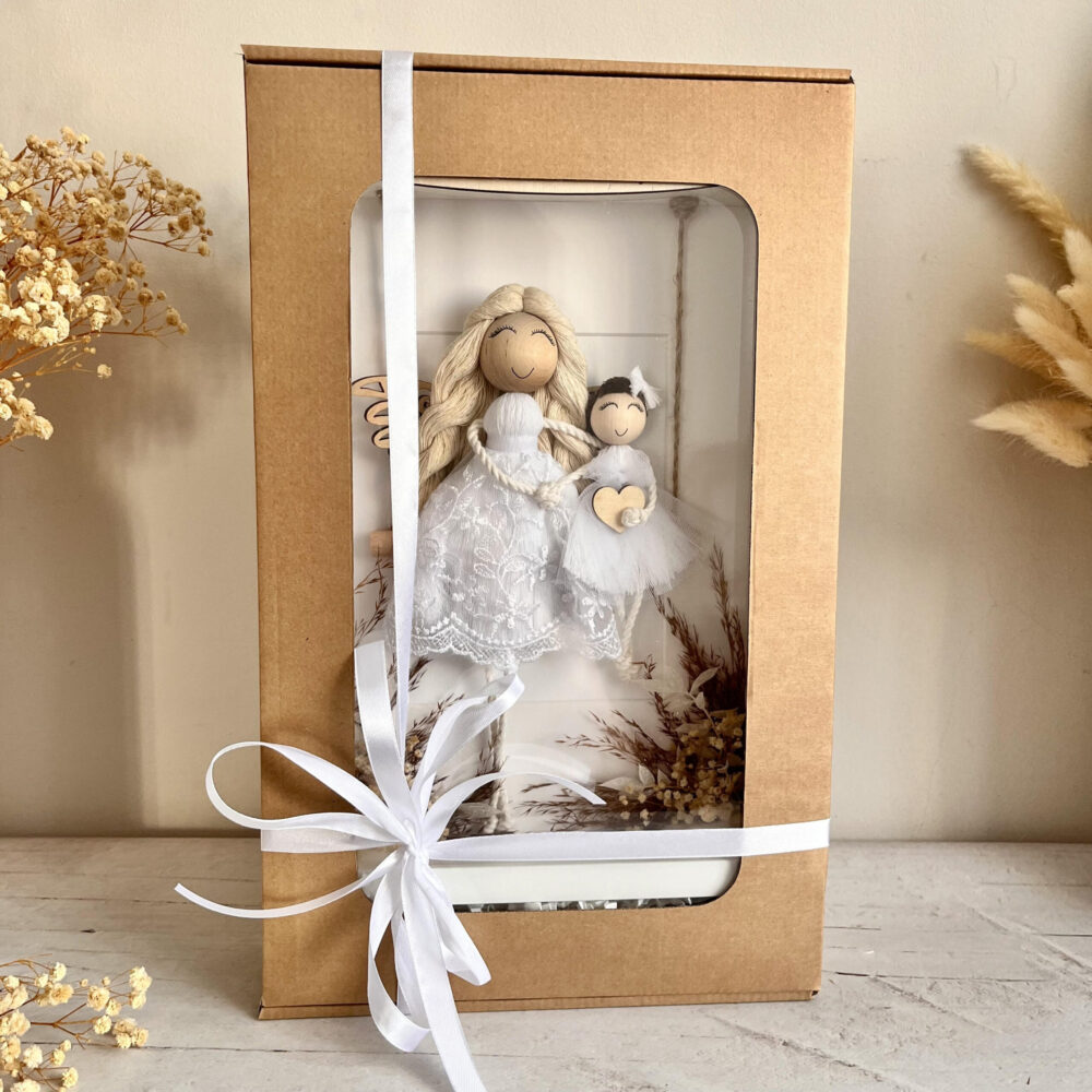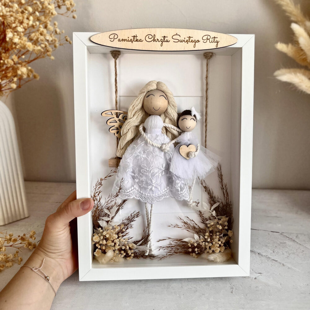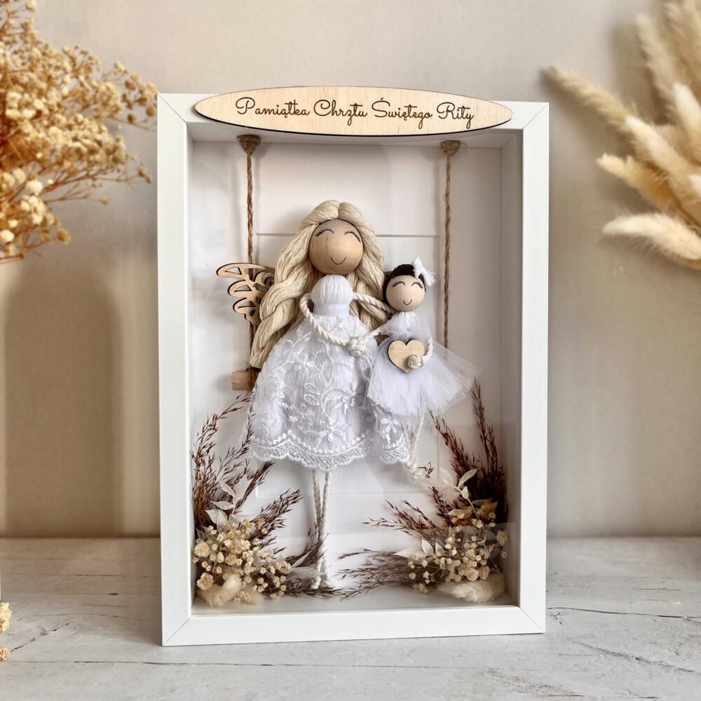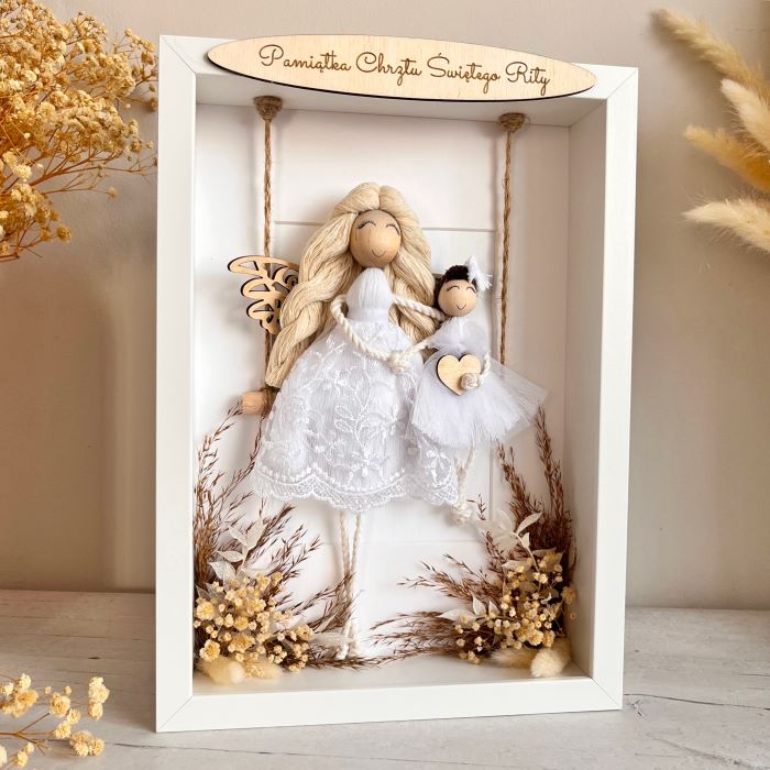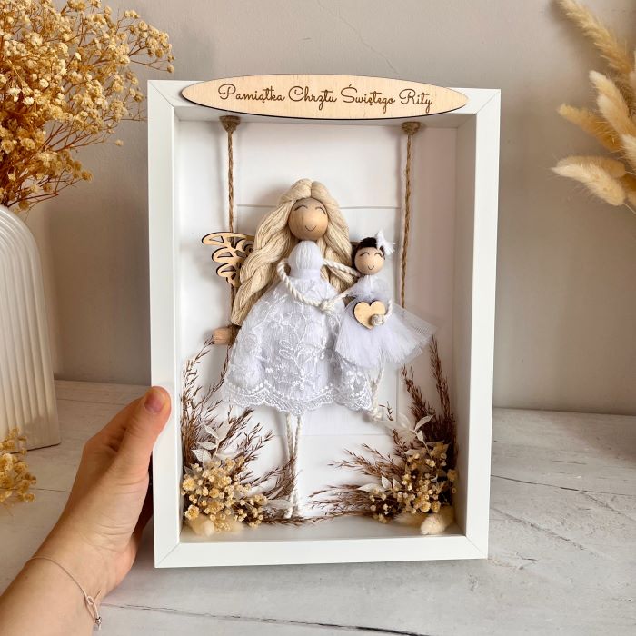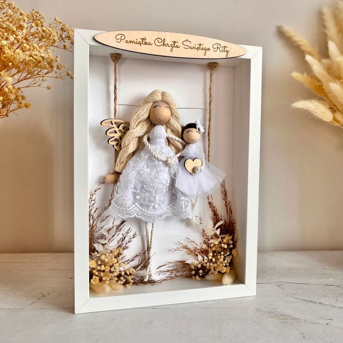 Aniołek siedzi na huśtawce z małą dziewczynką, co tworzy wyjątkowy obrazek przepełniony symboliką. Ramka ozdobiona suszonymi trawami i kwiatami idealnie wpasuje się we wnętrza klasyczne oraz w stylu boho. Na górze ramki umieszczona jest drewniana tabliczka z grawerem – możesz dodać dowolny tekst, co nada całości osobistego charakteru. Na odwrocie ramki mogę dodać tabliczkę z osobistymi życzeniami lub wierszykiem.