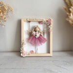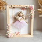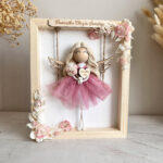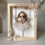 Każdy makramowy aniołek wykonany jest z najwyższej jakości materiałów – sznurka bawełnianego, tiulu oraz drewnianych elementów. Aniołek trzyma w rękach bukiecik z suszonych kwiatów i drewniane serduszko z grawerem, co czyni go jeszcze bardziej osobistym. Aniołek siedzi na huśtawce w drewnianej ramce, ozdobionej suszonymi roślinami i papierowymi kwiatami, które dodają mu delikatności. Na górze ramki można umieścić tabliczkę z dedykowanym tekstem, np. imię lub datę ważnego wydarzenia, a z tyłu ramki dodać życzenia, modlitwę lub dedykację.