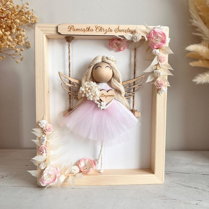 Personalizowany aniołek w drewnianej ramce to idealny prezent na Chrzest, Komunię Świętą, urodziny i inne wyjątkowe okazje. Jego unikalny design, ręczne wykonanie oraz personalizacja sprawiają, że jest to pamiątka, która cieszy przez długie lata. Aniołek to doskonały wybór jako pamiątka z okazji Chrztu lub komunijny prezent, który zostanie zapamiętany na długo.