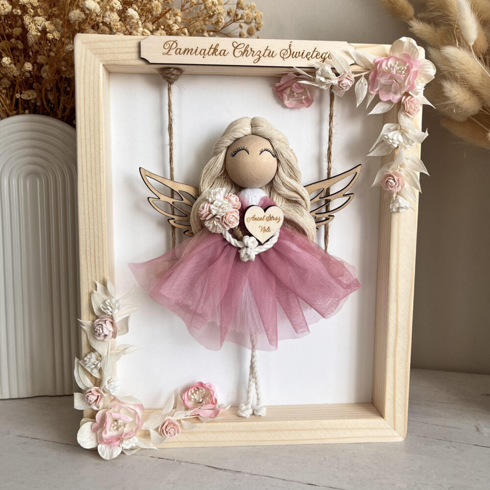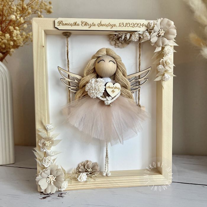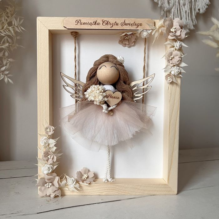 Makramowy Anioł w drewnianej ramce – personalizowany prezent na Chrzest, Komunię, urodziny i inne okazje