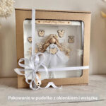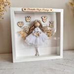 Metryczka dla dziewczynki – anioł stróż w białej gablotce, pamiątka na chrzest i roczek
