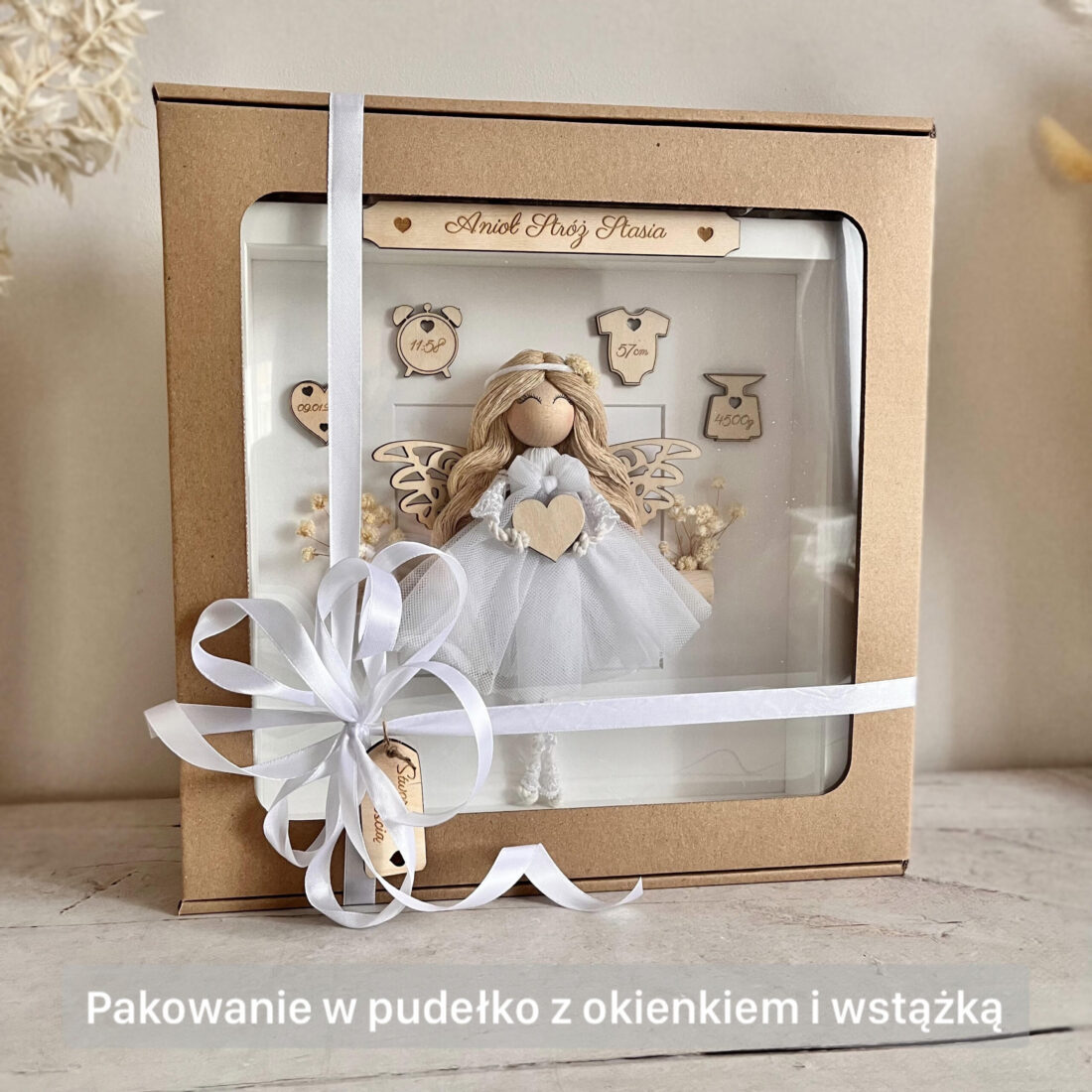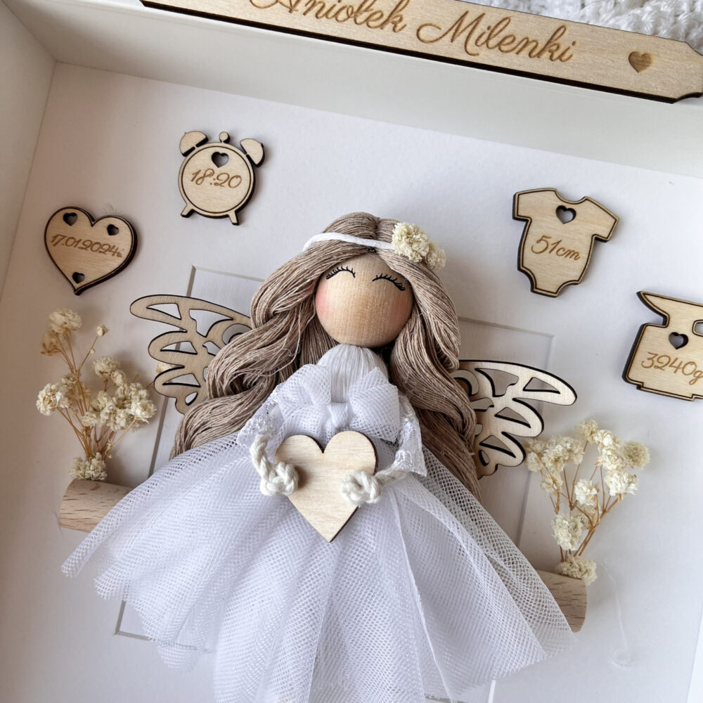 Każdego aniołka tworzę ręcznie, z dbałością o każdy szczegół. Wykorzystuję bawełniany sznurek, koronkę i drewniane elementy, dzięki czemu dekoracja wygląda subtelnie i naturalnie. Wewnątrz ramki umieszczam personalizowaną metrykę dziecka – tabliczki z wygrawerowanym imieniem, datą urodzenia, godziną, wagą i wzrostem. Dodatkowo, kompozycję uzupełniam stabilizowanymi kwiatkami, które nadają całości wyjątkowego uroku. Co więcej, na Twoje życzenie mogę dodać z tyłu ramki dodatkową tabliczkę z życzeniami lub dedykacją. Tak spersonalizowany prezent nabierze jeszcze większego znaczenia.