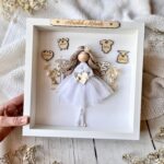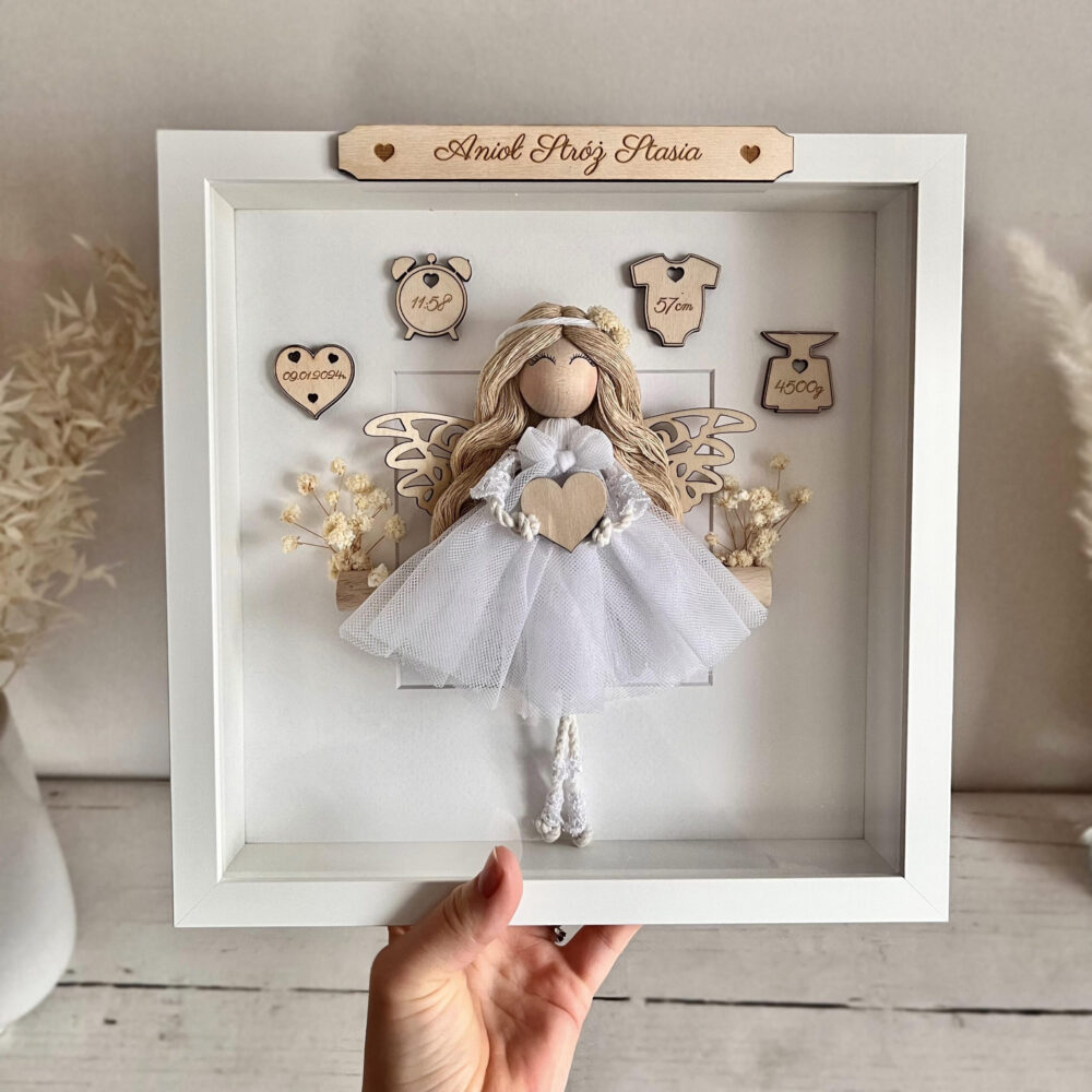 Dekoracja tworzona na zamówienie z dbałością o każdy szczegół i z użyciem bezpiecznych, nietoksycznych materiałów od sprawdzonych dostawców. Wszystkie elementy mocuję trwale i estetycznie, aby zapewnić piękny wygląd i bezpieczne użytkowanie. Ramka z aniołkiem pełni funkcję dekoracyjną i najlepiej prezentuje się ustawiona w dobrze widocznym miejscu, na przykład na komodzie oraz na półce. Aniołek w ramce nie jest zabawką, dlatego nie nadaje się do zabawy przez dzieci.