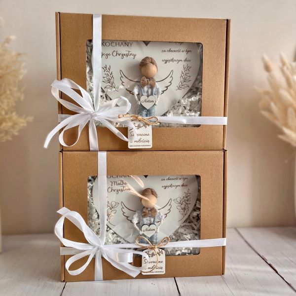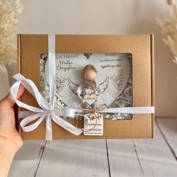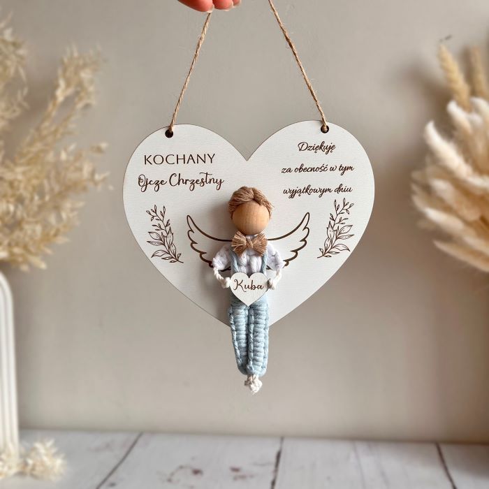 Podziękuj Ojcu Chrzestnemu w sposób piękny i pełen wdzięczności! Ręcznie wykonany anioł stróż z makramy, umieszczony w sercu z grawerem, to wyjątkowy upominek. Idealnie nadaje się na podziękowanie za obecność podczas takich uroczystości jak Chrzest Święty czy Pierwsza Komunia Święta. Eleganckie wykonanie, głęboka symbolika i personalizacja sprawiają, że prezent stanie się pamiątką na długie lata.