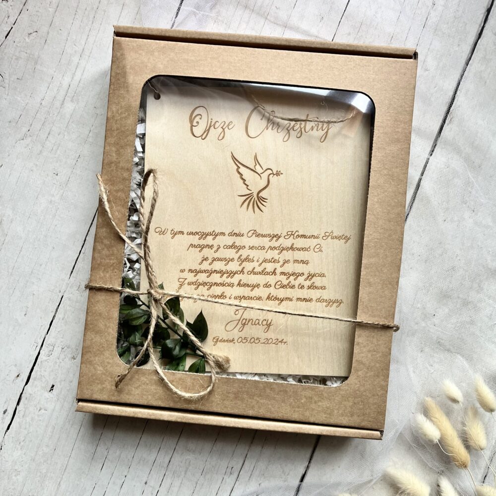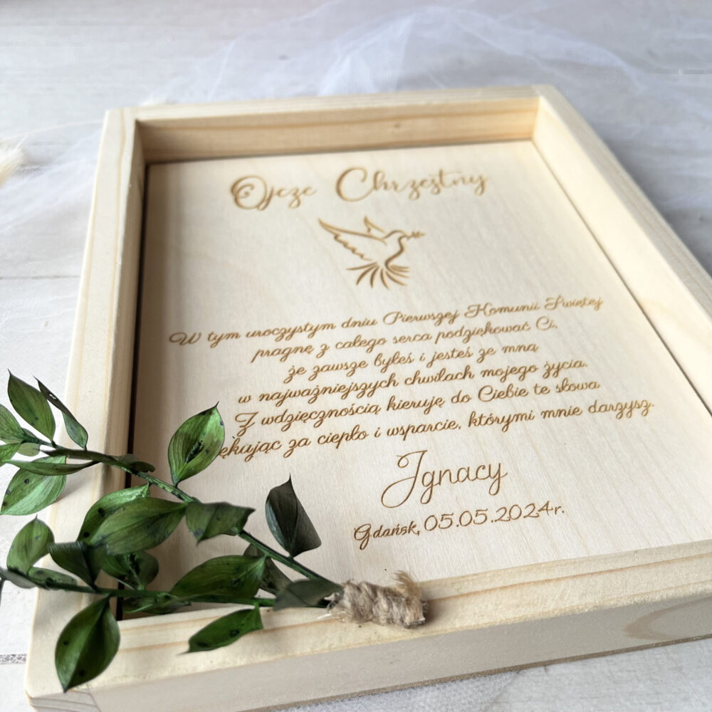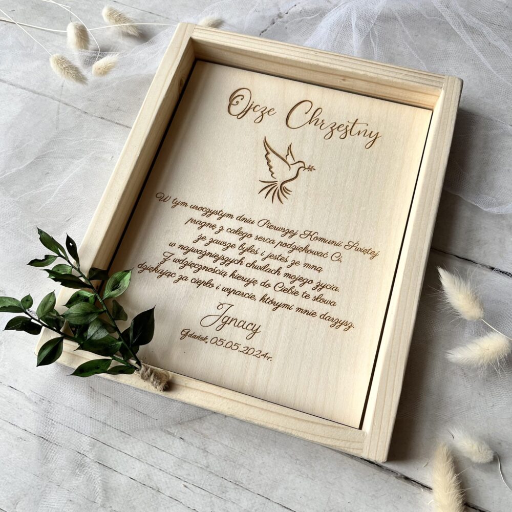 Podziękowanie w drewnianej ramie dla ojca chrzestnego – wyjątkowy prezent na komunię lub chrzest