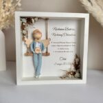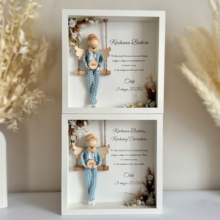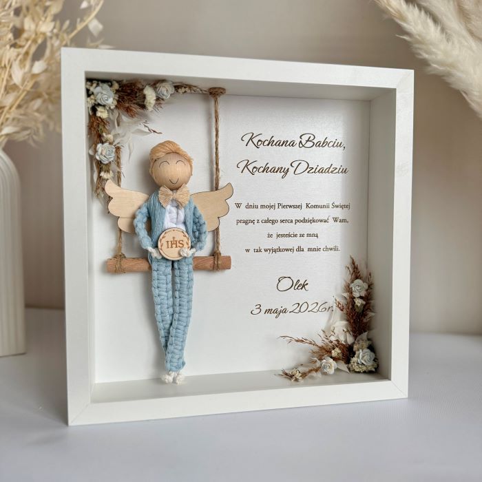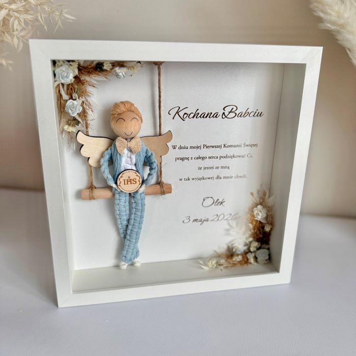Subtelna, ręcznie wykonana pamiątka, która pozwala w piękny sposób wyrazić wdzięczność za obecność, wsparcie i miłość w tak ważnym dniu jak Chrzest Święty, roczek czy Pierwsza Komunia Święta. Ten aniołek w eleganckiej ramce to coś więcej niż prezent, to wzruszające „dziękuję”, które zostaje na lata.