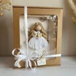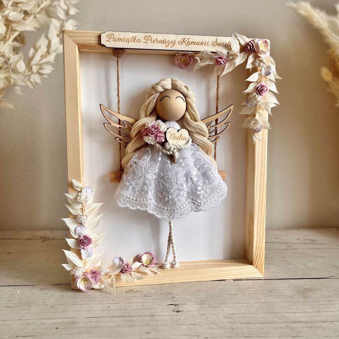 Aniołek wykonany z wysokiej jakości sznurka bawełnianego w kolorze białym, tiulowej koronki i drewnianych dodatków trzymający w rękach bukiecik z suszonych kwiatów oraz drewniane serduszko z grawerem. Aniołek siedzi na huśtawce w drewnianej ramce ozdobionej suszonymi roślinami i papierowymi kwiatami. Na górze oraz na dole ramki są tabliczki, na których mogę umieścić Twój tekst. Z tyłu mogę dodać większą tabliczkę z życzeniami, modlitwą lub dedykacją – możesz to określić w opcjach zamówienia.