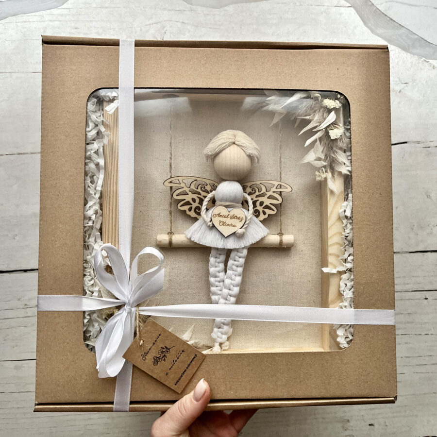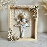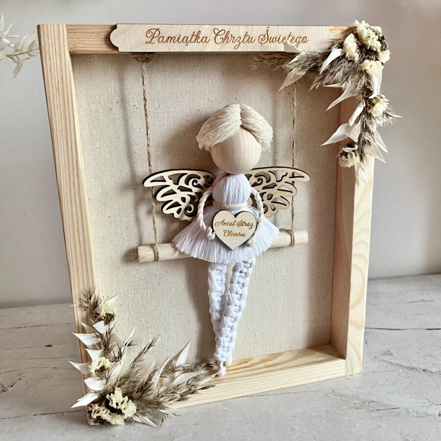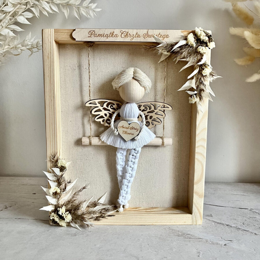 Personalizowany anioł w ramce to urocza i wdzięczna ozdoba, która poza walorami wizualnymi ma również symboliczne znaczenie. Makramowy aniołek jest wspaniałym pomysłem do wręczenia jako Pamiątka Komunii Świętej. To też wyjątkowe uzupełnienie wystroju pokoju chłopca.